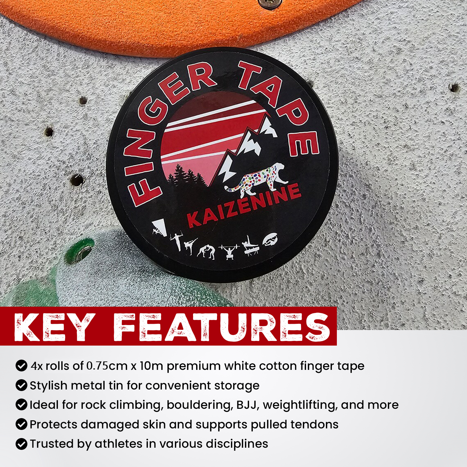 Kaizenine finger tape is a crucial asset for protecting damaged skin and providing essential support for pulled tendons. It's a versatile solution suitable for all climbers from lead to bouldering. Our 0.75cm wide sport tape is perfect for rehabilitating worn-out skin and relieving aching tendons. The tape is perfectly sized to protect the specific areas in need of support.